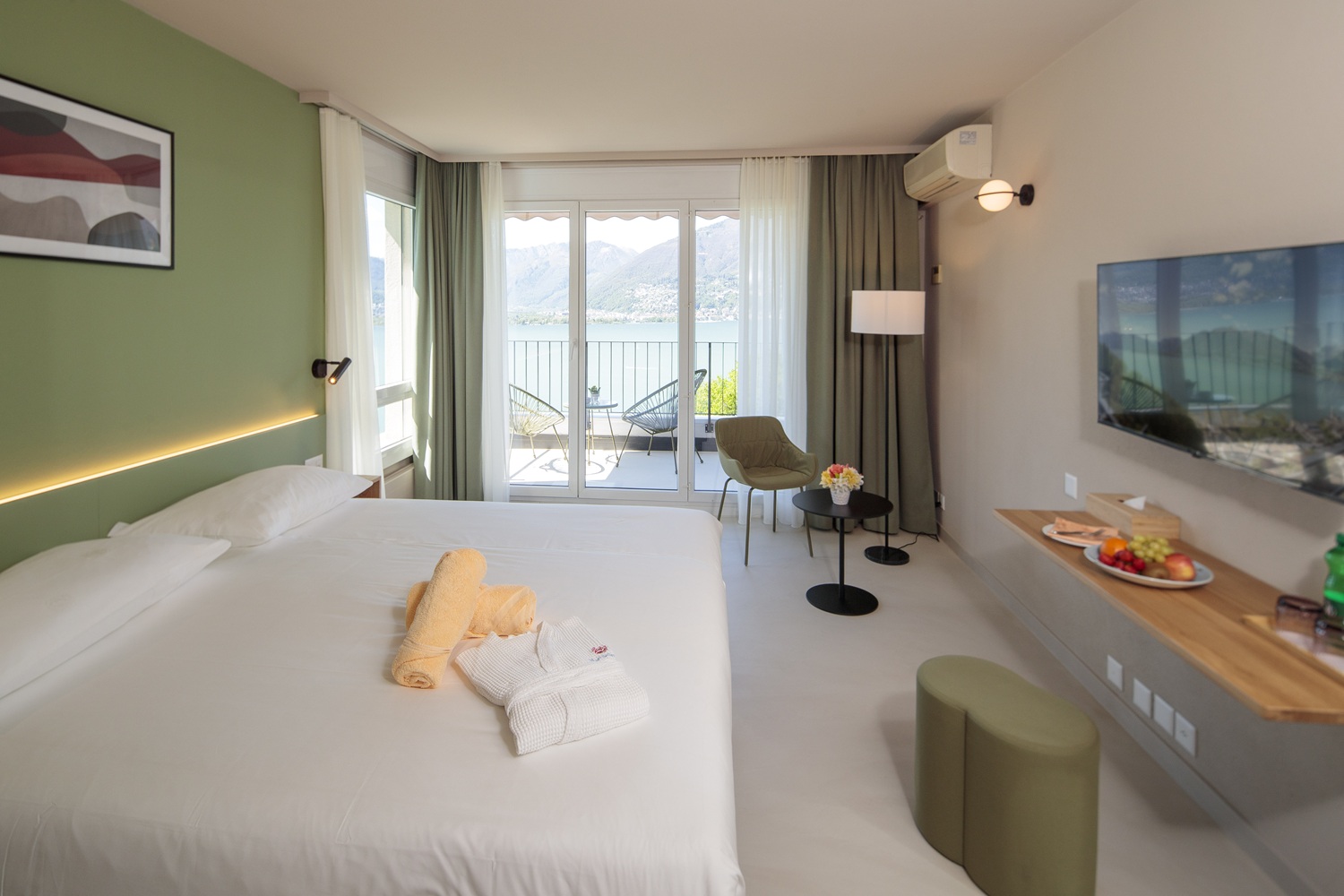 Keine telefonischen BuchungsanfragenDie Bellavista Deluxe Double Rooms befinden sind allesamt im Hauptgebäude. Alle Zimmer sind komfortabel eingerichtet mit einem Doppelbett, mit fantastischem Blick auf den Lago Maggiore und direktem Blick auf den Pool und den Monte Gambarogno. Die Zimmer verfügen allesamt über eine Dusche, Klimaanlage, WC, Haartrockner, Wi-Fi Internet, HD-TV mit integriertem Radio, Safe, Balkon.Zimmerausstattung