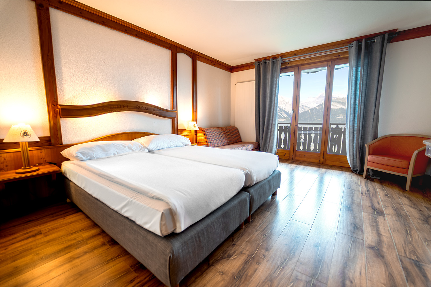 Keine telefonischen BuchungsanfragenStandardzimmer für bis zu 2 Personen (2 getrennte Betten) mit fantastischem Blick auf das Rhonetal. Alle unsere Zimmer sind hell, geräumig und komfortabel. Sie verfügen über ein Badezimmer mit Badewanne, WC, Haartrockner, Fernseher, Wifi, Safe und Minibar.