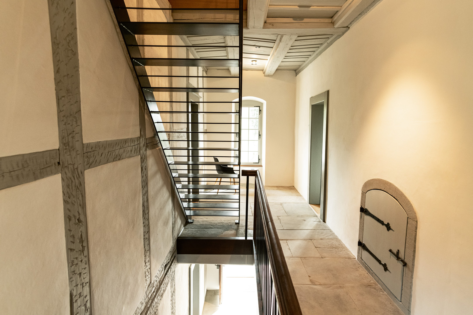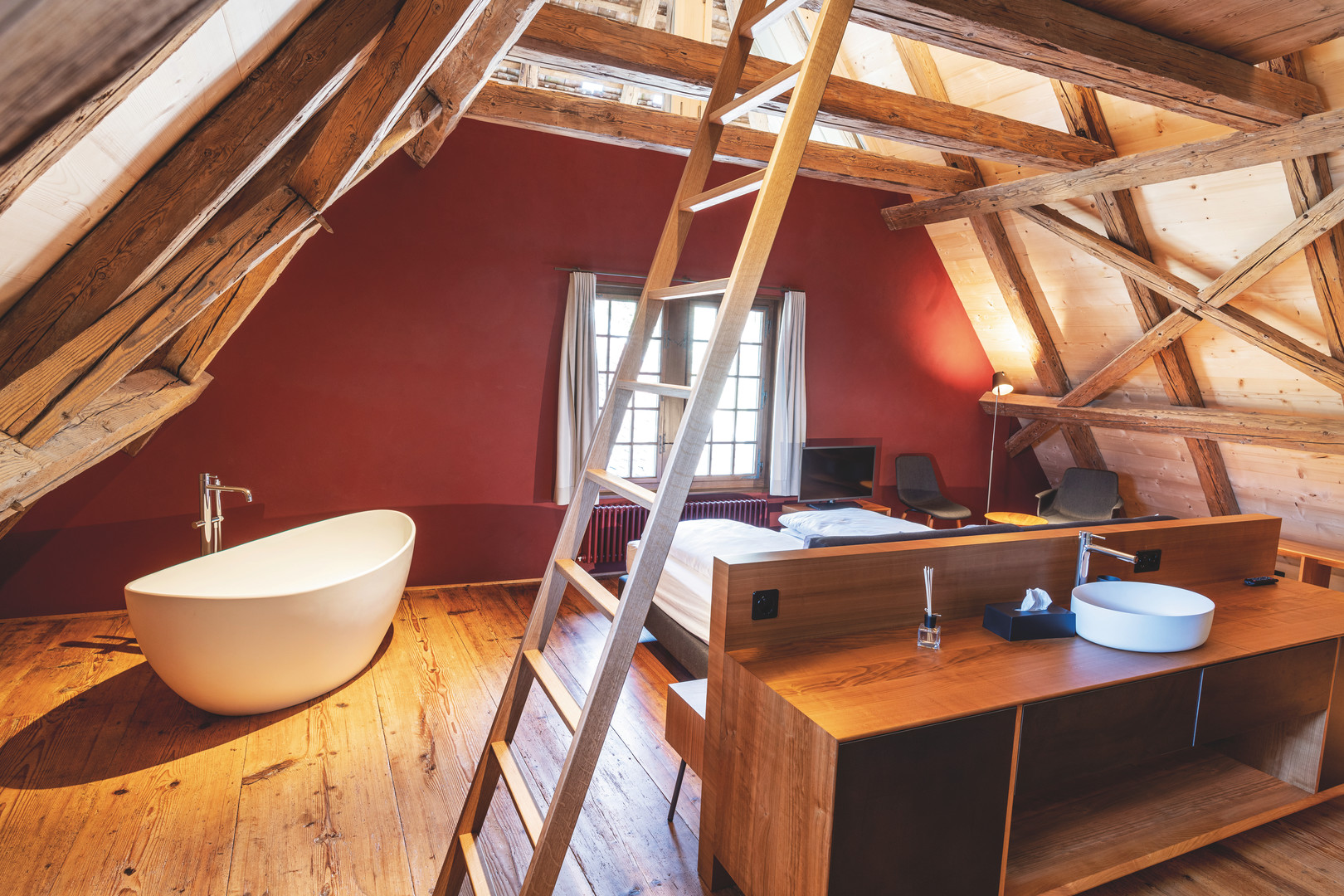 No booking requests by phoneOn the top floor of the renovated Knappenhaus, the Junior Suite awaits you. It impresses with its high ceiling beneath the open gable, a free-standing bathtub, a modern shower and WC cabin, as well as a mezzanine level that you can reach via a ladder. A special atmosphere for a special night.