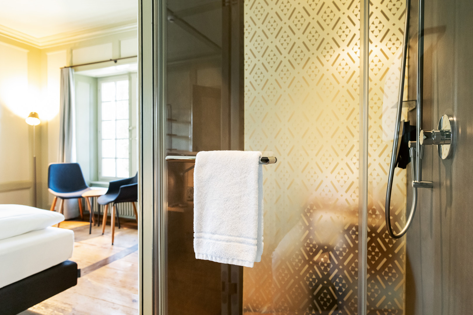 No booking requests by phoneThe individually designed deluxe double room. It combines carefully preserved and renovated elements with modern design and high-quality furnishings to make your stay as comfortable as possible. A shower, toilet, and TV are included as standard. Whether you are staying here alone or with three other people, you will feel completely at home.