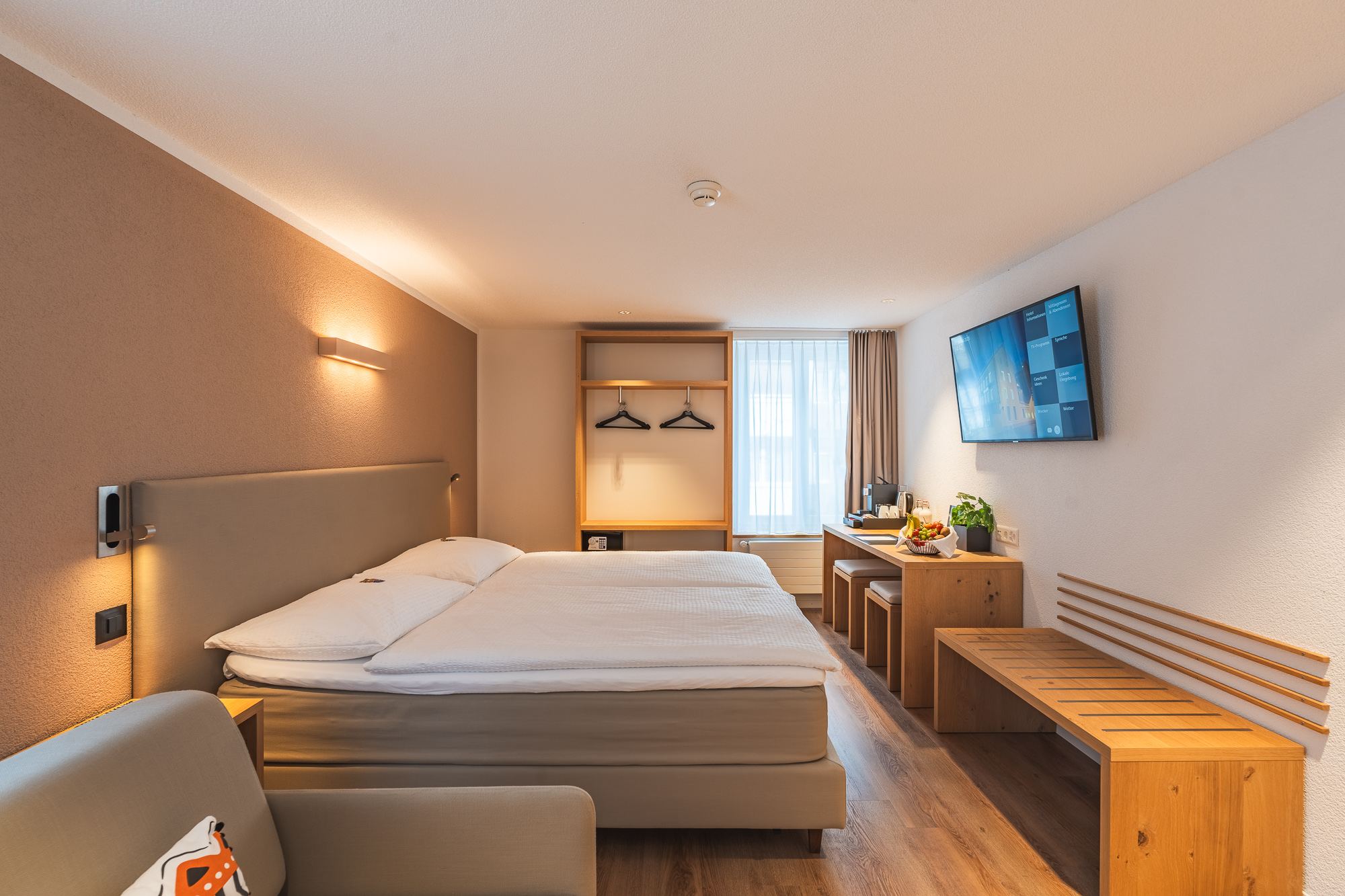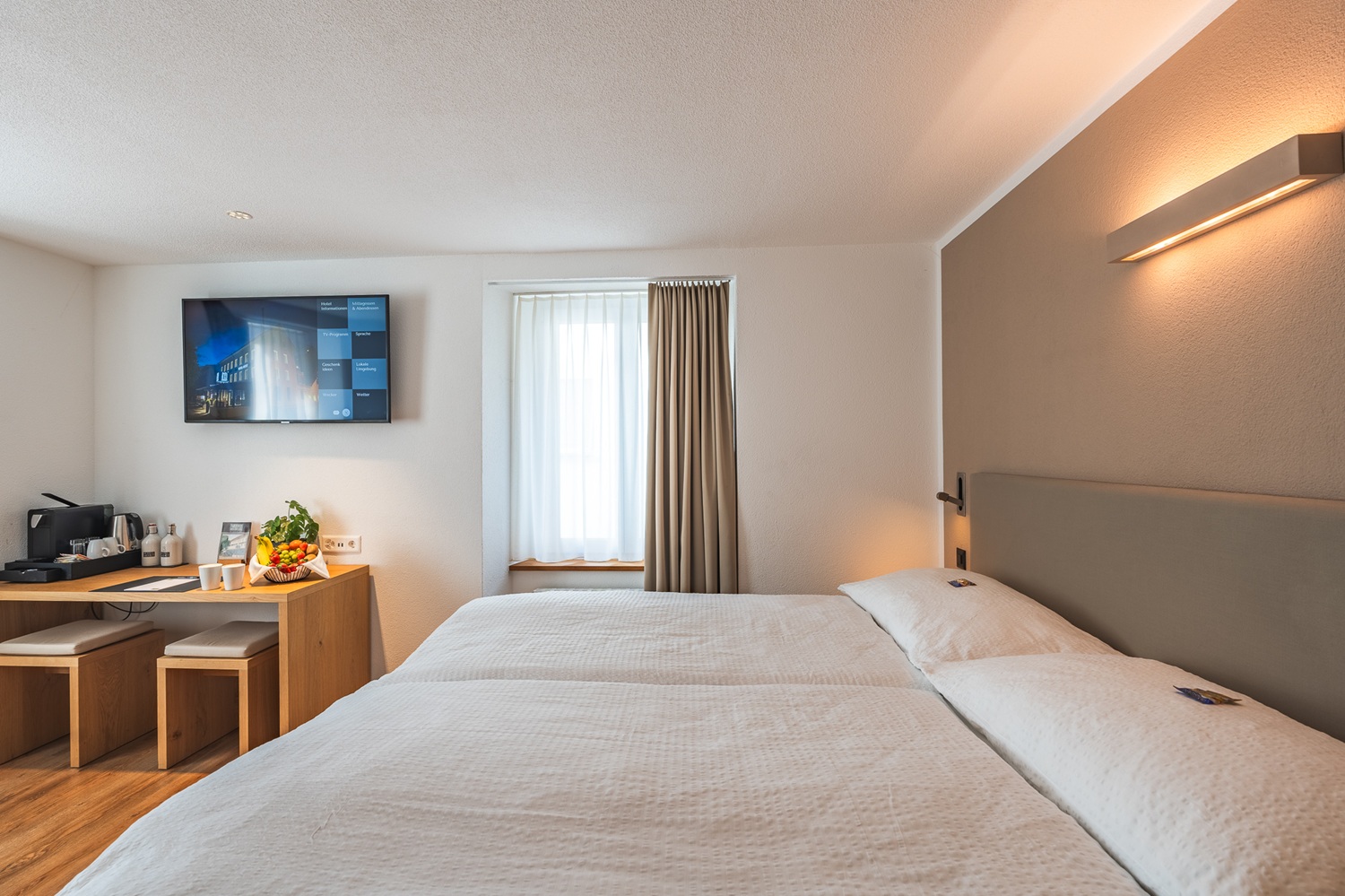 Nos chambres se distinguent par un aménagement élégant et de grande qualité et offrent un espace confortable pour se détendre. Le large lit boxspring de 180 cm garantit un sommeil réparateur et peut être configuré en deux lits simples si nécessaire.