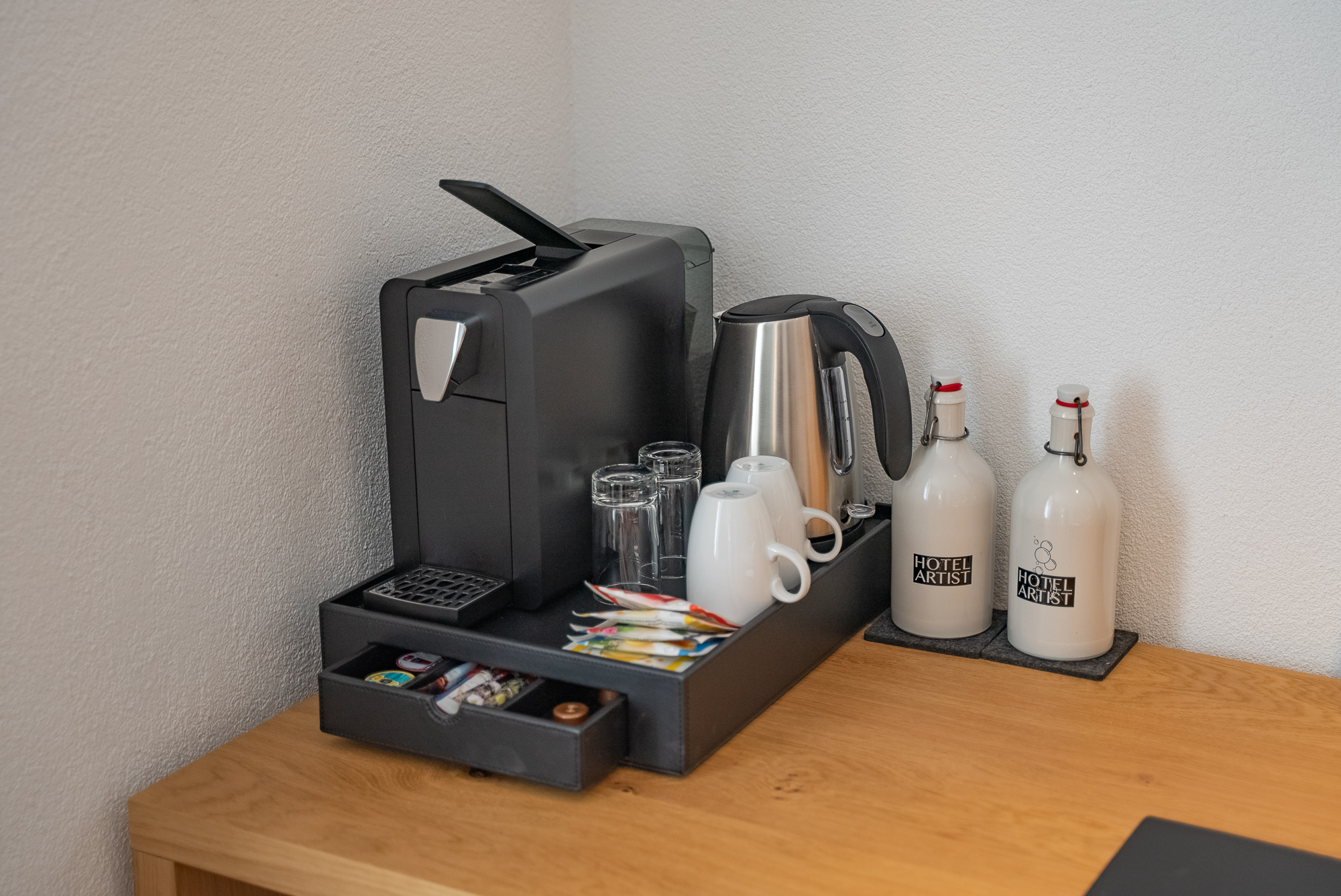 La chambre est en outre équipée d’une machine à café et d’une bouilloire. De l’eau minérale plate et gazeuse est mise gratuitement à votre disposition.